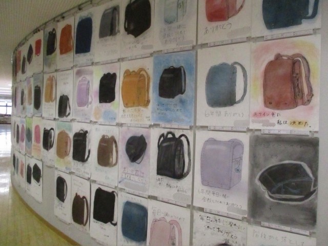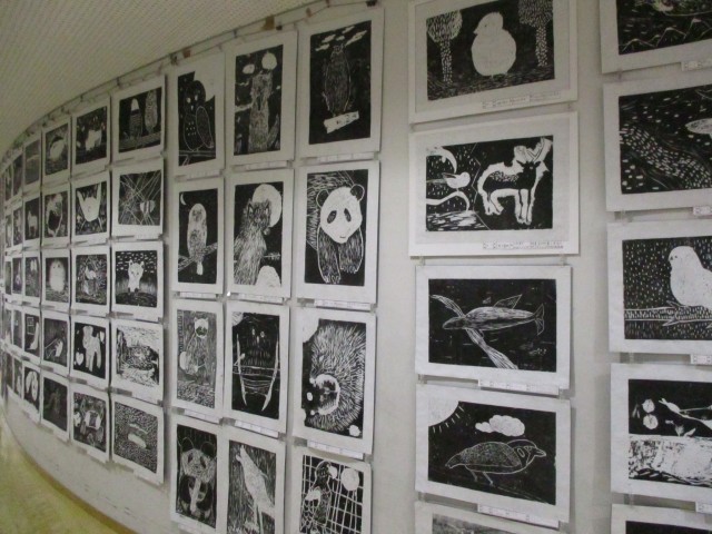 4階には6年生の通学かばんや校帽への感謝(一部詫び)の気持ちを表した作品、3階には4年生の毛並みを意識して彫り進めた版画が飾られています。
