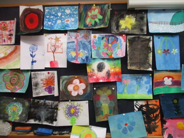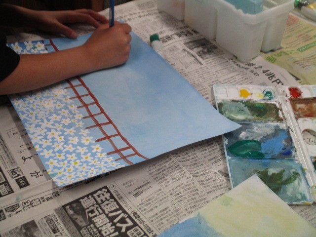 「まぼろしの花」という題材を取り組みました。誰も見たことがない花を、色や形、香りや開花時刻、開花場所をきっかけにイメージし、絵の具の扱い方を工夫して描きました。