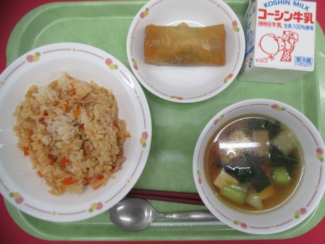今日は、さつまいもごはんをつくりました。さつまいもは、秋が旬で甘くてほくほくしているのが特徴です。今日は、炊飯器に細かく切ったさつまいもを入れて炊きました。 しおさけも油がのっていて、ごはんがすすむおかずです。今日は秋においしい食材も使った献立でしたが、給食では、たくさんの旬の食材を出すので楽しみにしてください。