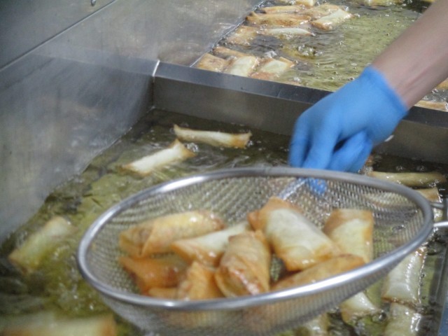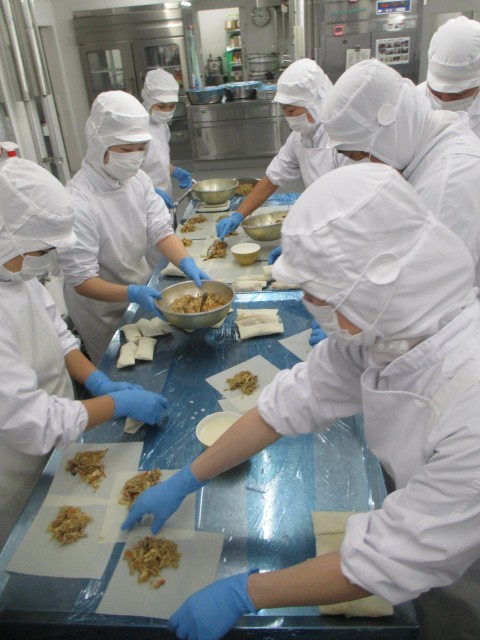 体育祭の練習も本格的に始まって、疲れがたまりやすい時期でもあります。このような時期には、栄養をしっかりとって、体力を落とさないことが大切です。給食室でもスタミナ満点のおいしい給食を届けられるようがんばっています。さて今日の給食は、春巻を作りました。朝から野菜を千切りにして、ぶた肉と一緒に炒めて、春巻の皮に1つずつ包みました。ぶた肉には、疲れを回復するビタミンB1が入っています。 -