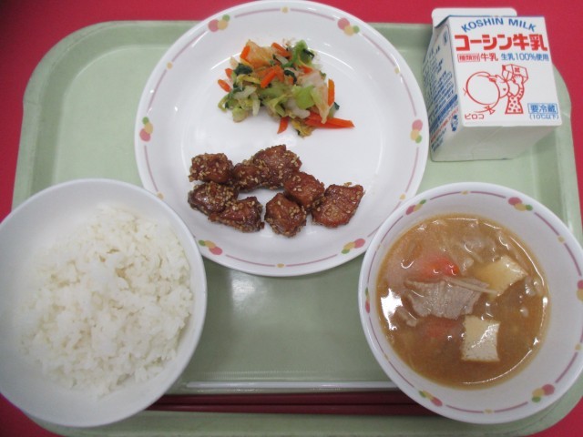 今日の主菜は「かつおの生姜ソース」です。角切りのかつおにでん粉をつけて油で揚げ、生姜をたっぷり使ったソースを、ごまと一緒に絡めました。実は、「かつおの生姜ソース」は、給食では今年度2回目の登場です。1回目は、5月の給食で登場しました。