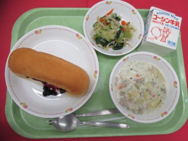 今日は、さつまいもごはんをつくりました。さつまいもは、秋が旬で甘くてほくほくしているのが特徴です。今日は、炊飯器に細かく切ったさつまいもを入れて炊きました。 しおさけも油がのっていて、ごはんがすすむおかずです。今日は秋においしい食材も使った献立でしたが、給食では、たくさんの旬の食材を出すので楽しみにしてください。