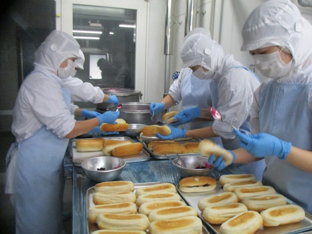 今日は、大人気のメニューのイカの薬味焼きです。イカを調味料で漬けた後、オーブンで焼きます。イカが柔らかく仕上がるので食べやすいです。きのこの豚汁にはエノキやシメジ、マイタケの3種のキノコが入っているので栄養満点の汁物になっています。少し、涼しくなってきましたが体調を崩しやすいのでしっかり食事をとることが大切です。