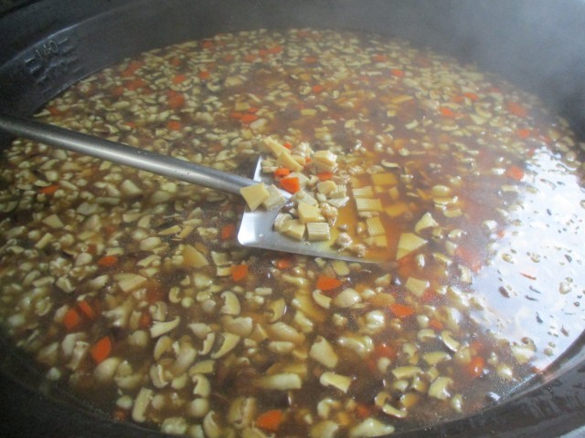 毎月19日は食育の日です。今月は石川県の「治部煮」を作りました。「治部煮」は、石川県の郷土料理として有名です。もともとは、江戸時代に、渡り鳥や、かも肉を、すだれ麩、季節の野菜などと煮た料理で、肉に小麦粉をまぶすのが特徴です。小麦粉をまぶすことで、汁にとろみがつきます。最近では家庭で作るときには、かも肉は高級なので、鶏肉を使用して作ります。家庭では、おもてなしや、特別な日の料理として食べられている一方、郷土料理を提供する料亭などでも提供されているそうです。 -