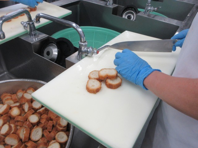 今日はデザートに「スイートポテト」を作りました。今日は東京産のさつまいもを使っています。水分が多く、しっとりとしたさつまいもが届いたので、さつまいもをつぶし、牛乳・生クリームでなめらかにした生地をカップにつめて、焼き色をつけました。「スイートポテト」は、外国から来たお菓子のイメージがありますが、実は日本発祥のお菓子です。