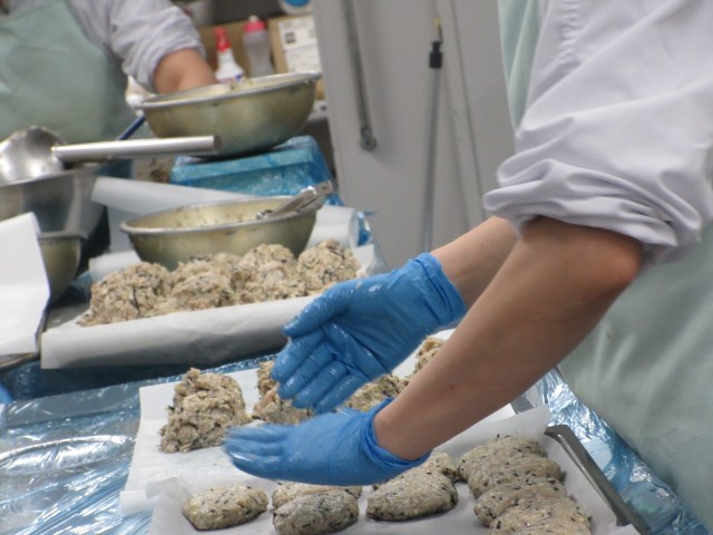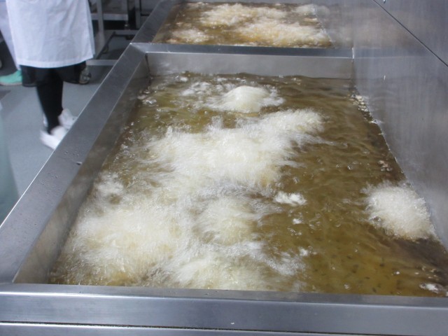今日は「さかなとコーンのうまに」をつくりました。さかなだけではなく、野菜もたっぷり入っているメニューです。食材を一つ一つ丁寧に油で揚げてつくっています。また、味付けに使われているオイスターソースもアクセントになっています。副菜の磯和えには刻みのりがたくさん入っているため、のりの香りを楽しむことができます。