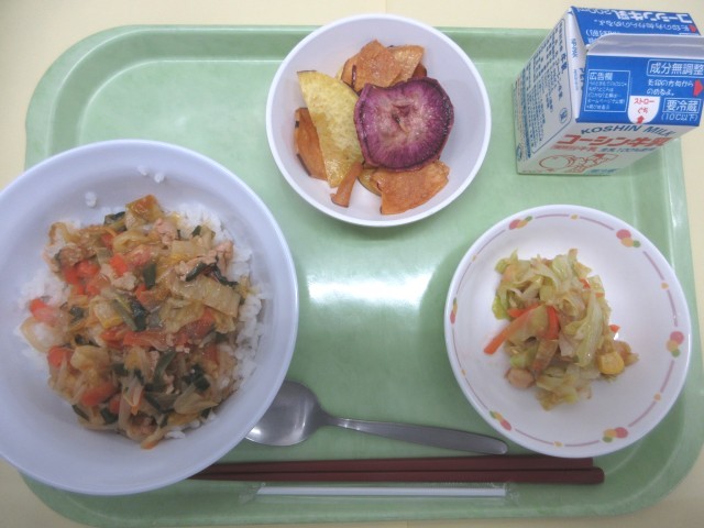 11月24日は「和食の日」です。2013年にユネスコ無形文化遺産に和食が登録されたことから、和食を保護・継承していくことの大切さを改めて考える日として、11月24日が「和食の日」になりました。和食の日献立ということで、さつまいもやきのこ、れんこんなどの秋が旬の食材をたくさん入れた「あきのかおりごはん」をつくりました。いかのかりんとうがらめも人気のメニューです。