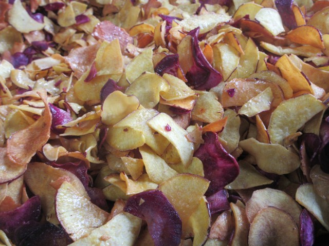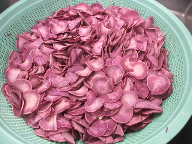 また、今日の補食はフラワーチップです。さつまいもと、むらさきいもを薄く切って油で揚げることで、花びらのようにヒラヒラとした形になります。