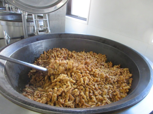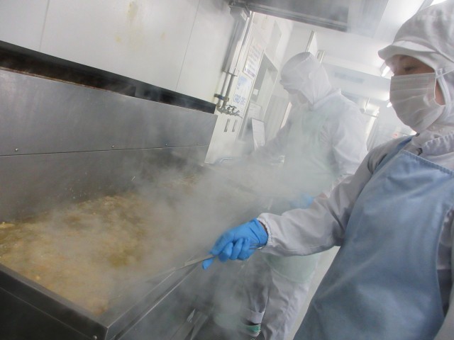 今日は給食室のエアコンが壊れてしまい、朝から室温が3℃の中、調理をしていたためイカを揚げる際など加熱調理をするたびに給食室に湯気が上がっていました。 -