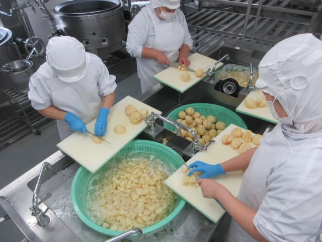 今日の汁物は、北海道の「どさんこ汁」です。「どさんこ」とは、北海道でうまれたもののことを言います。北海道は、広大な大地で、農作物や酪農が盛んな地域です。これらの野菜やバターを使った汁物を「どさんこ汁」とよんでいます。北海道は、玉ねぎを始め、収穫量が全国1位の食材がたくさんあり、この「どさんこ汁」1杯で北海道のおいしさが楽しめます。今日は北海道産のじゃが芋やコーンを使いました。