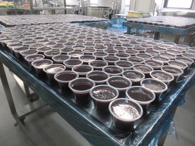今日のデザートはぶどうゼリーでした。エアコンの故障により、給食室全体がとても冷えているので、カップにゼリー液を注ぐと、冷蔵庫に入れる前にすぐに固まりました。