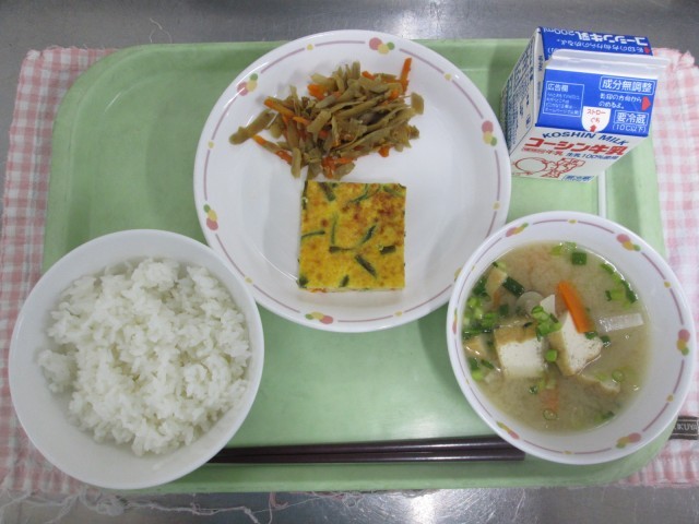 ごはん(秋田)、たまごやき、きんぴらごぼう、みそしる、ぎゅうにゅう
