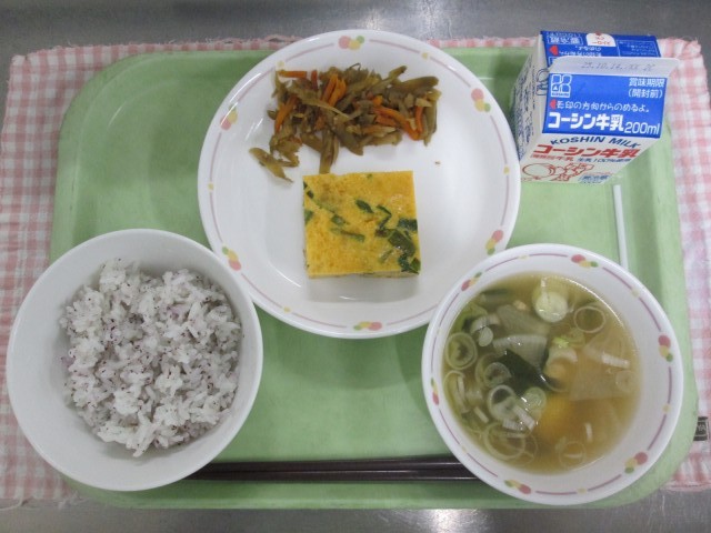 ゆかりごはん、あつやきたまご、きんぴらごぼう、つきみじる、ぎゅうにゅう