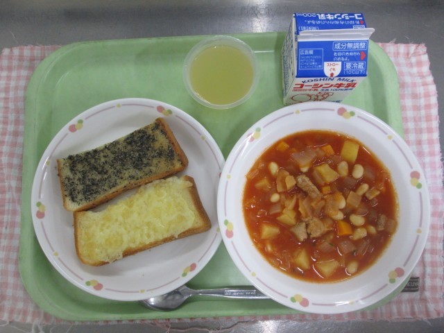 チーズトースト、セサミトースト、ポークビーンズ、りんごゼリー、ぎゅうにゅう