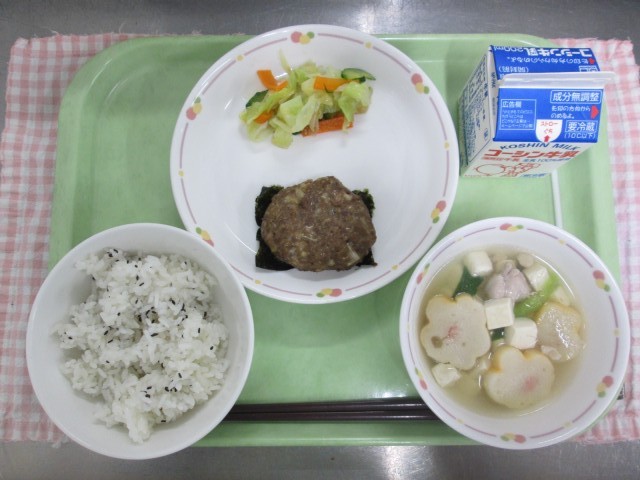 ごまごはん、いわしのさんがやき、やさいのあまずあえ、すましじる、ぎゅうにゅう