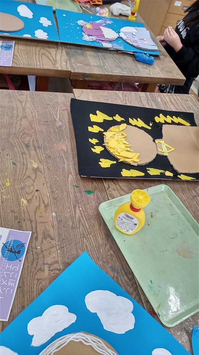 11月18日 図工(3年2組) 公開日 2025/11/18 更新日 2025/11/18 3年生 「でこぼこエレメント」この世界をつくっている要素(もととなっているもの)の神様のような妖精の姿を想像しました。 3年生