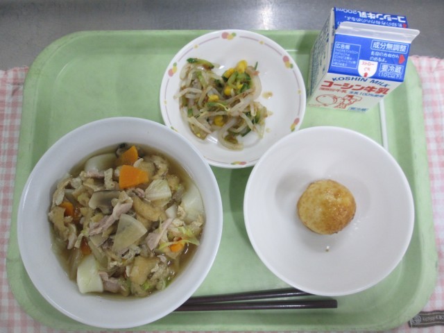 おっきりこみ、いとこんにゃくとやさいのあえもの、やきまんじゅう、ぎゅうにゅう