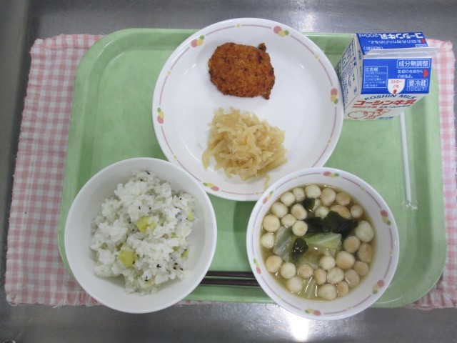 いもくりごはん、とうふのまさごあげ、だいこんのきんぴら、みそしる、ぎゅうにゅう