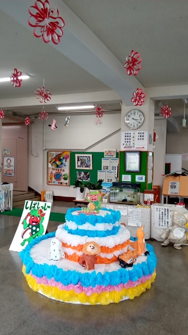 子供たちが作成した140歳を祝ったケーキが飾られています。