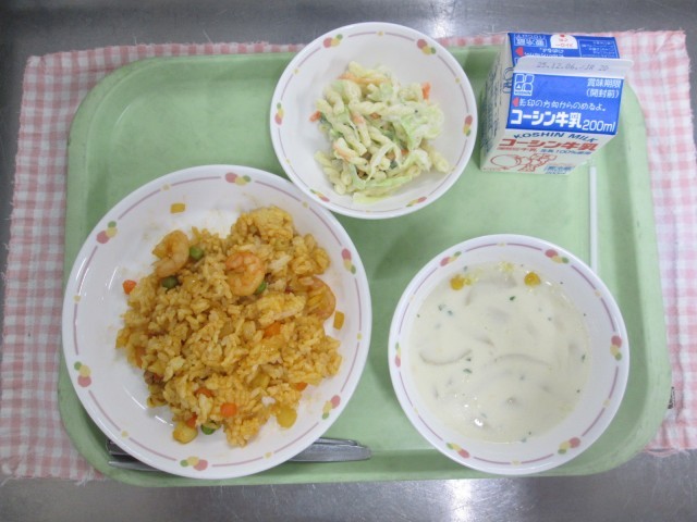 カレーピラフ、マカロニサラダ、コーンスープ、ぎゅうにゅう