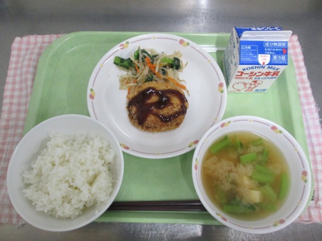 ごはん(秋田)、とびうおのメンチカツ、いとかんてんのごまずあえ、あさりいりみそしる、ぎゅうにゅう