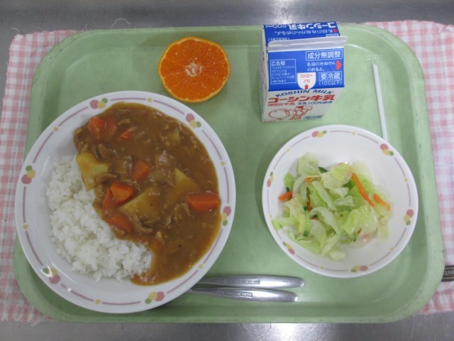 ポークカレー、グリーンサラダ、くだもの、ぎゅうにゅう