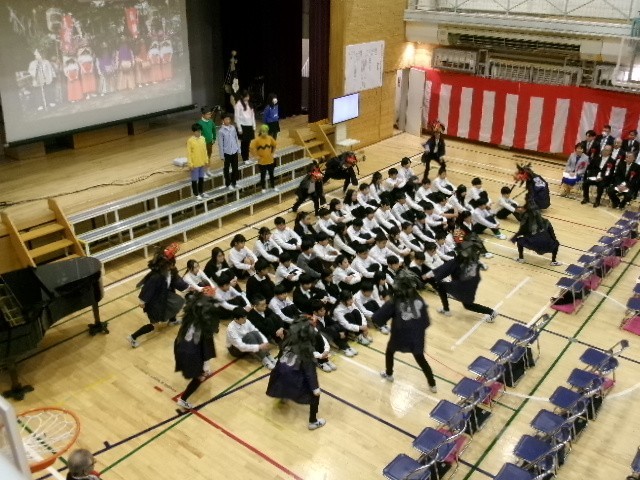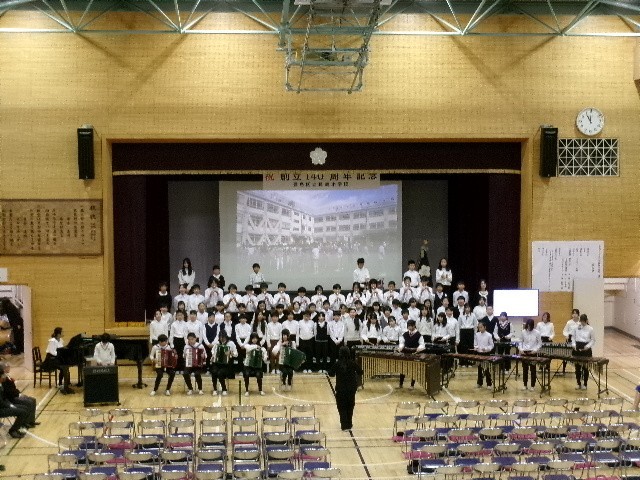 5年生、6年生の「お祝いの言葉」では、140年の歩みを劇と呼びかけで表現しました。