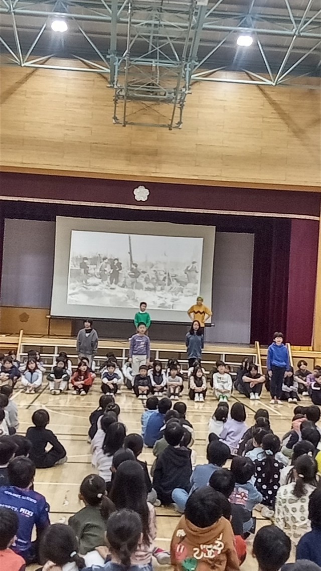 12月10日 長崎小の歴史を伝えよう1 公開日 2025/12/10 更新日 2025/12/10 全学年 140周年記念式典で発表した、「お祝いの言葉」を1年生から4年生の子供たちにも披露しました。140年の歴史がとても分かりやすく表現されています。