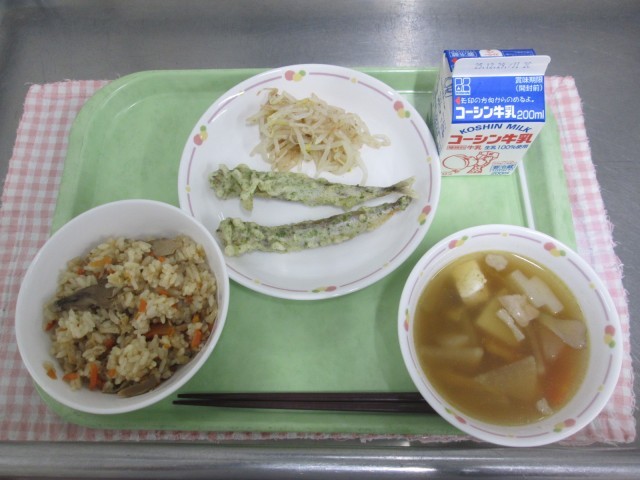 まいたけごはん、ししゃものいそべあげ、もやしのあえもの、いもに、ぎゅうにゅう