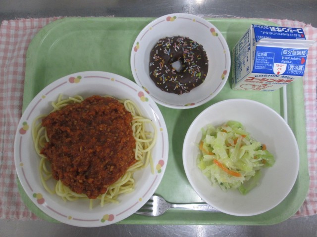 スパゲティミートソース、グリーンサラダ、やきドーナッツ、ぎゅうにゅう