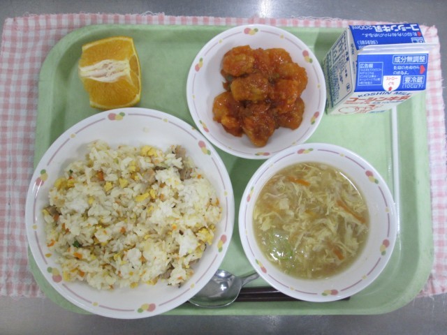 チャーハン、とりとえびのチリソース、ちゅうかふうコーンスープ、くだもの、ぎゅうにゅう