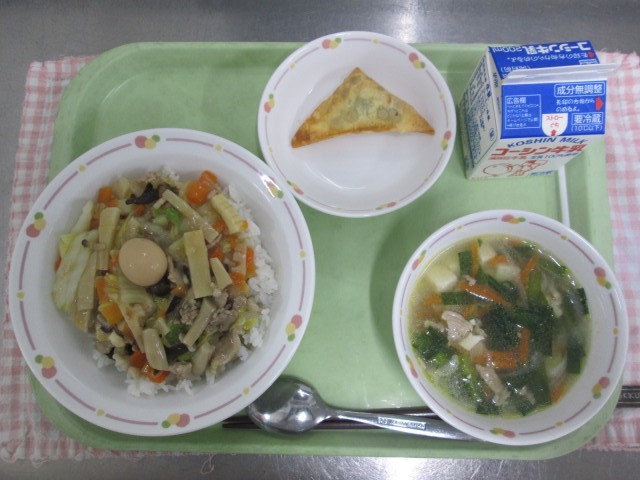 ちゅうかどん、にらととうふスープ、ごまあんのあげワンタン、ぎゅうにゅう