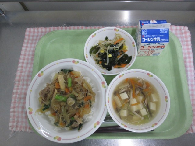 マーボーはるさめどん、もやしのナムル、きくらげととうふのスープ、ぎゅうにゅう