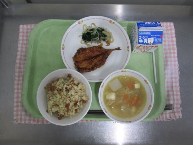 まめごはん、いわしのかばやき、おひたし、けんちんじる、ぎゅうにゅう