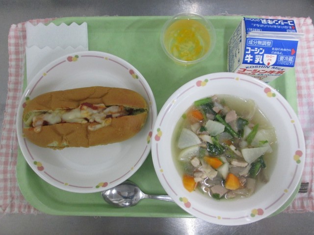あしたばパンのピザドッグ、ポトフ、フルーツゼリー、ぎゅうにゅう
