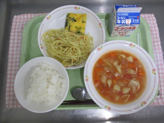ごはん、ほうれんそうのフリッタータ、ボンゴレビアンコ、ミネストローネ、ぎゅうにゅう