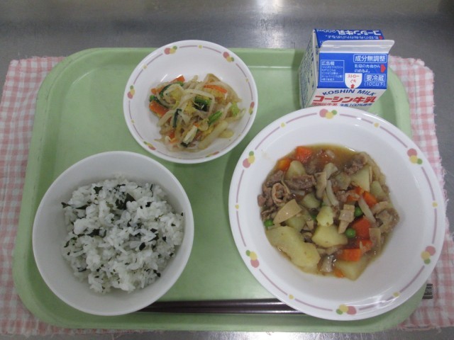 わかめごはん、にくじゃが、ごまあえ、ぎゅうにゅう