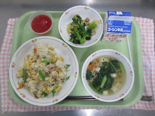はるのちらしずし、はるやさいのおひたし、うしおじる、ももゼリー、ぎゅうにゅう