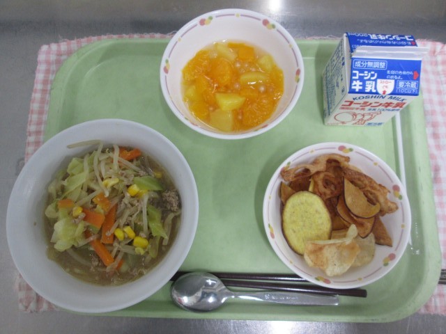 みそラーメン、やさいチップス、タピオカポンチ、ぎゅうにゅう