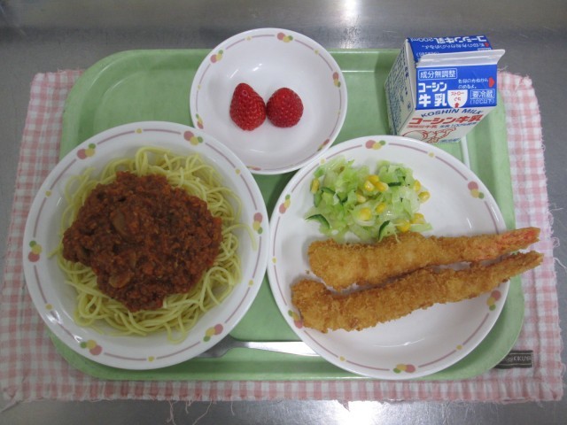 スパゲティミートソース、えびフライ、コールスローサラダ、くだもの、ぎゅうにゅう