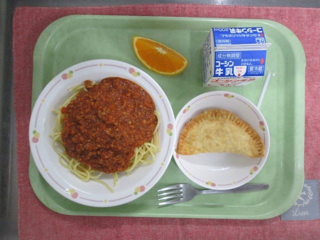 スパゲティミートソース パリッとポテト くだもの