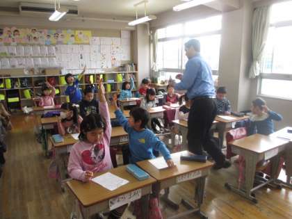 1年2組の英語活動。今日は、「What fruits do you like?」「I like ○○.」のスキットに合わせて、たくさんのフルーツの名前を覚えて、ビンゴゲームを楽しみました。