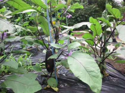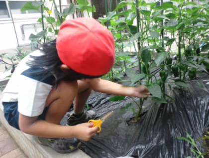 学級園の野菜が、大きくなりました。きゅうり、なす、ピーマンを収穫しました。