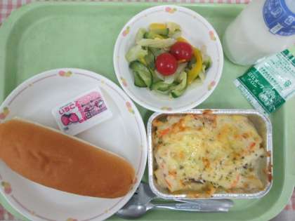 牛乳 コッペパン ジャム&マーガリン マカロニグラタン トマトサラダ ミルメイク