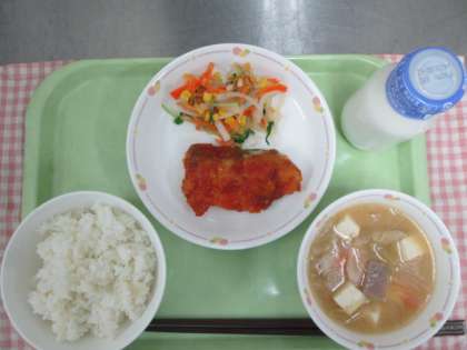 牛乳 豚汁 白身魚チリ風味 和風大根サラダ