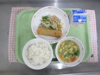 牛乳 わかめごはん 鶏の照り焼き 卵焼き 野菜の煮物 フライドポテト たこウインナー 冷凍みかん