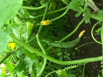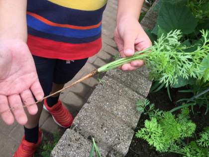 2年生 野菜が育ってきたよ その2 公開日 2016/07/01 更新日 2016/07/01 2年生 キュウリはもう4本も収穫しましたが、たくさん花が咲いて小さな実も育っているので、まだまだ収穫できそうです。ナスがあまりよく育っていないので、ナスの苗を植えた子にあげようね…と話しています。枝豆は来週には収穫できそうです。ニンジンは種から育てましたが、順調に育っています。間引きしたニンジンの根っこがちょっぴりオレンジ色になっていました。 2年生