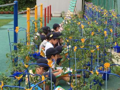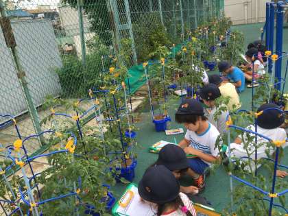 2年生 トマトの実の観察 公開日 2016/07/06 更新日 2016/07/06 2年生 今日は、クラスごとにトマトの実の観察をしました。どの子のトマトにもたくさん緑色の実がついていますが、中には赤くなってきたものもあります。「実がつながってついているね。」「実がついている茎には葉っぱがないよ。」「何センチになったかな〜。」などと、気づいたことがたくさんありました。 2年生