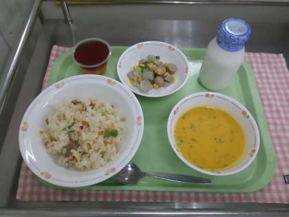 ガーリックピラフ ウインナーと野菜のサラダ かぼちゃとにんじんのスープ オレンジとグレープの二色ゼリー 牛乳