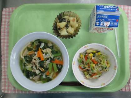 こぎつねうどん ポテトのツナマヨやき あおだいずいりサラダ ぎゅうにゅう